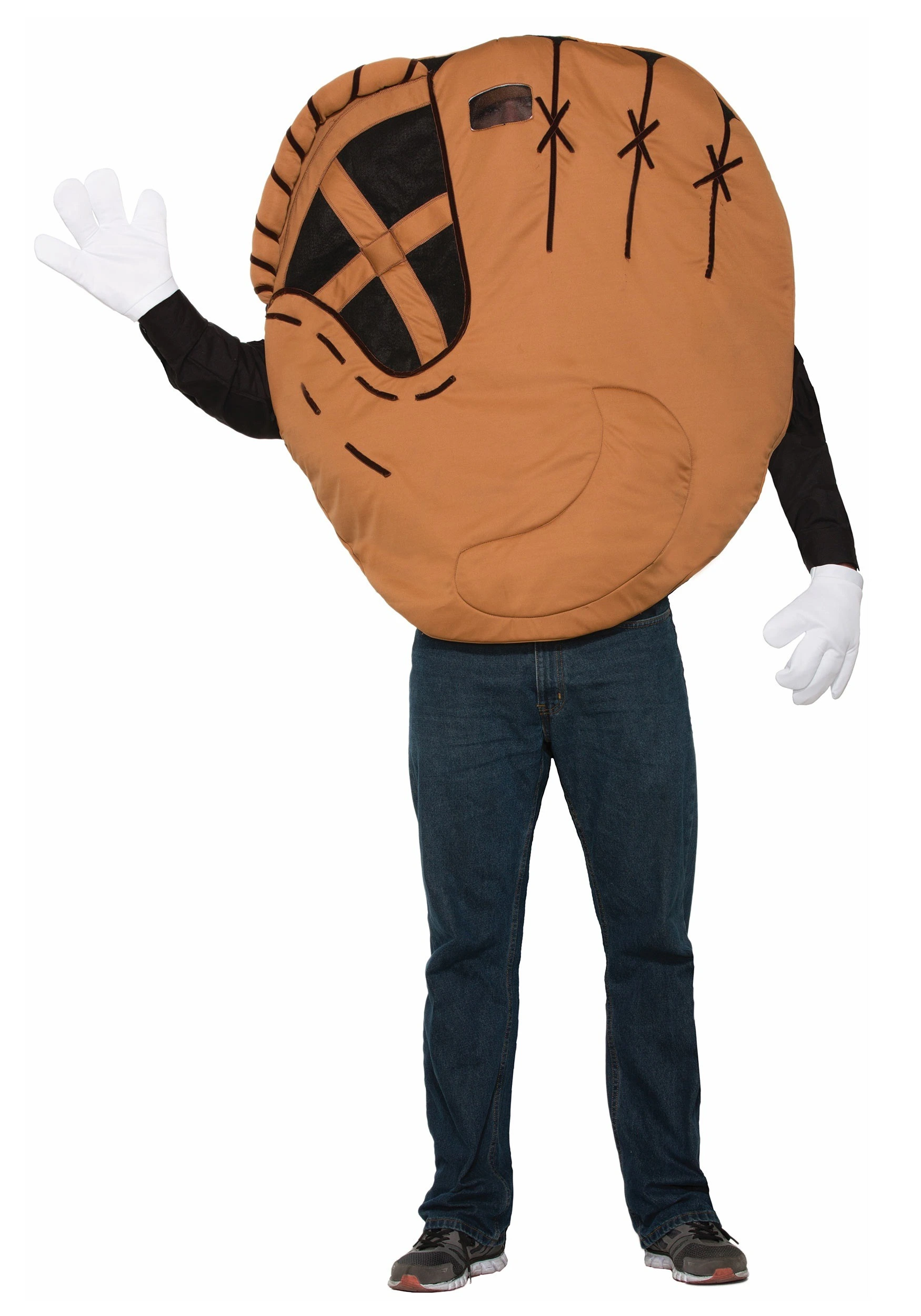 You want a costume that celebrates America’s storied history of athletics. You enjoy the sound of the crack of the bat, the smell of hot dogs and beer, and the sight of thongs of fans crowded around to witness grown men in wool pajamas run around in a square. Well, you won’t have to sing “Take me out to the ball game” anymore. No, with this Adult Baseball Mitt Costume, you’re a baseball MVP––the game will come to you! Just wear this baseball mitt costume and an impromptu baseball is sure to break out no matter where you are. It’s irresistible! Just find something to use as a ball and you’re all set. You could be in the aisles of the supermarket, and all of a sudden, batter’s up! An old man pitches an apple down the chips aisle. It’s a curveball, but a kid in a stroller-cart manages to hit it with a zucchini while her mom looks at the salsa display. You dive, catch the apple-ball right inside your glove-body, sliding into the frozen food aisle. It isn’t called America’s past-time for nothing!