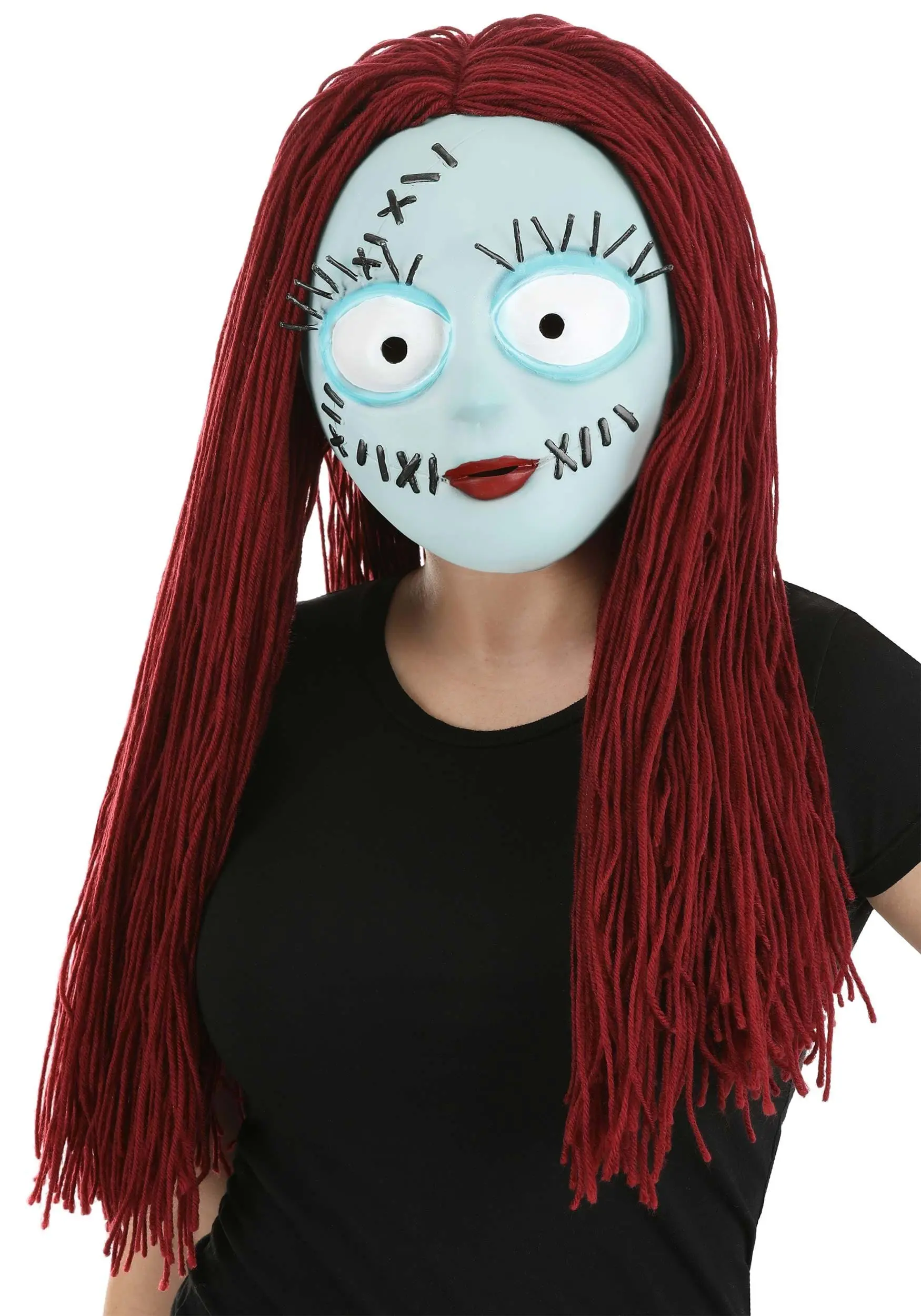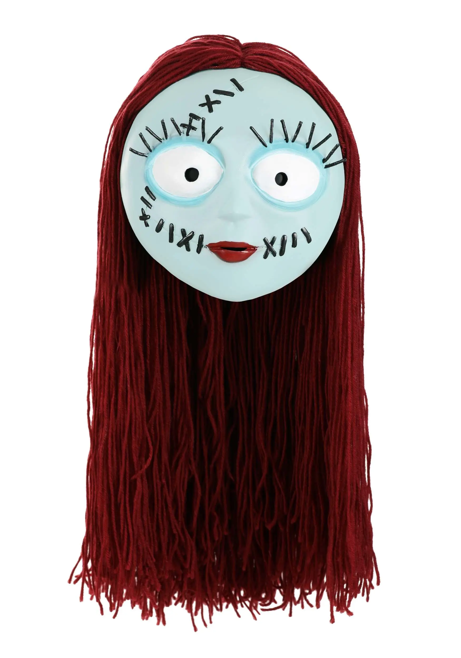 - Back of mask has mesh panel covered with dark red yarn “hair” that covers back & sides of head