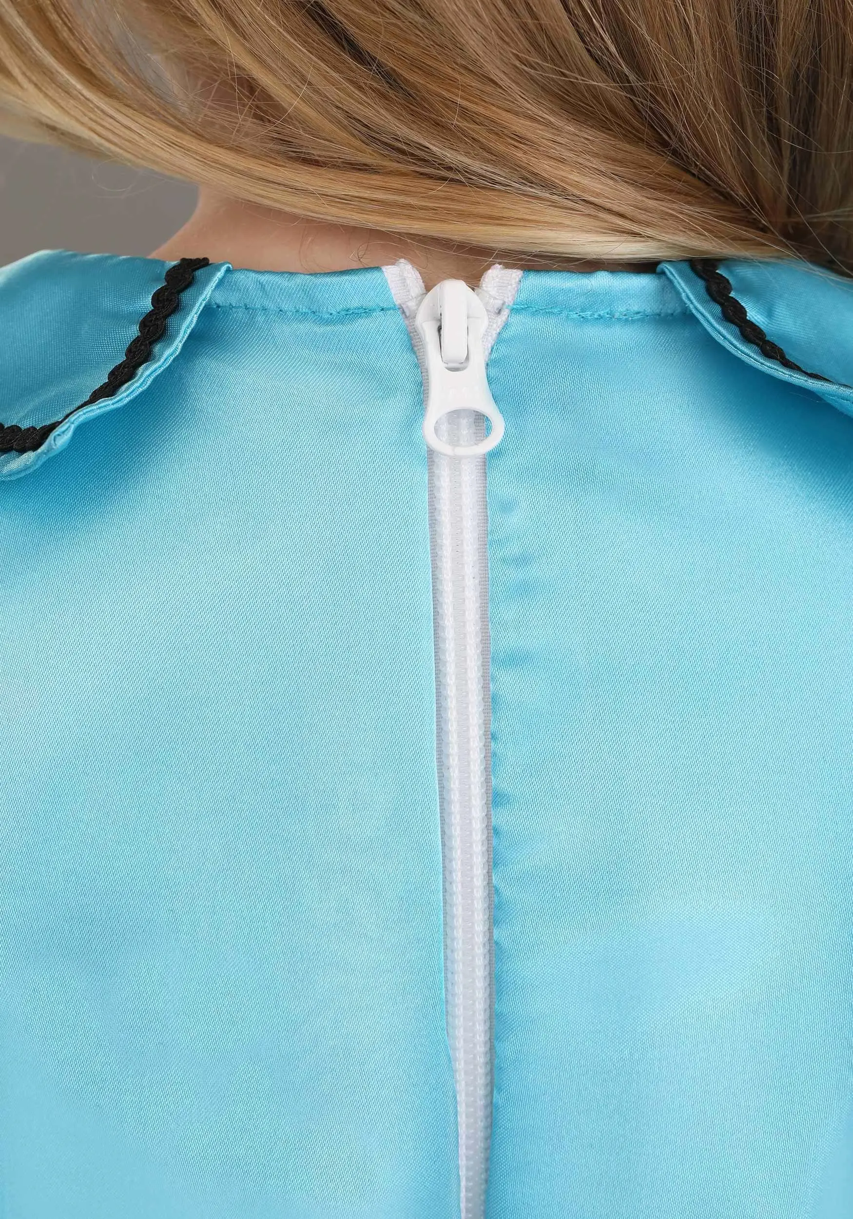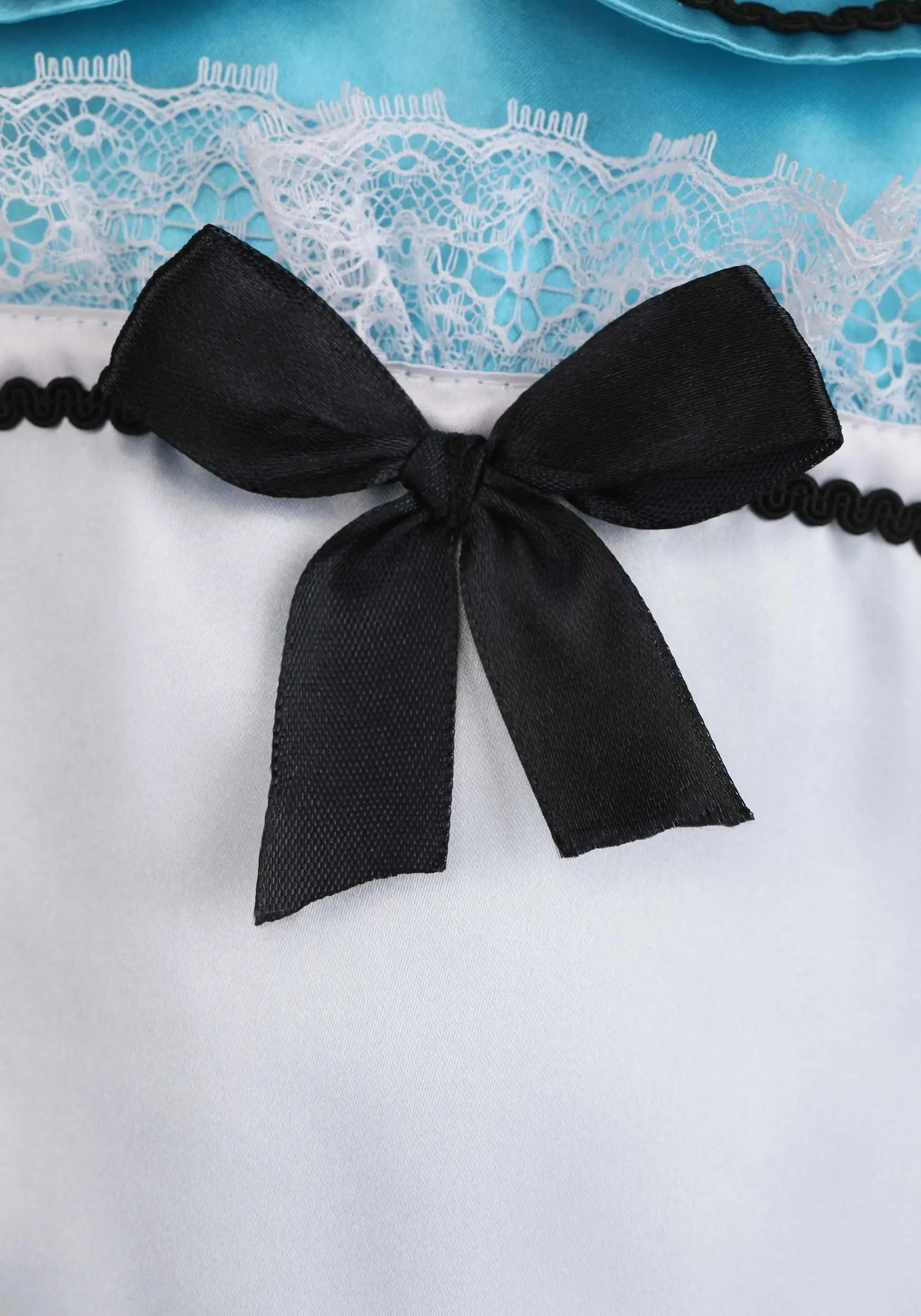 - Black braid trim on collar, sleeve cuffs, & attached lace-edged apron