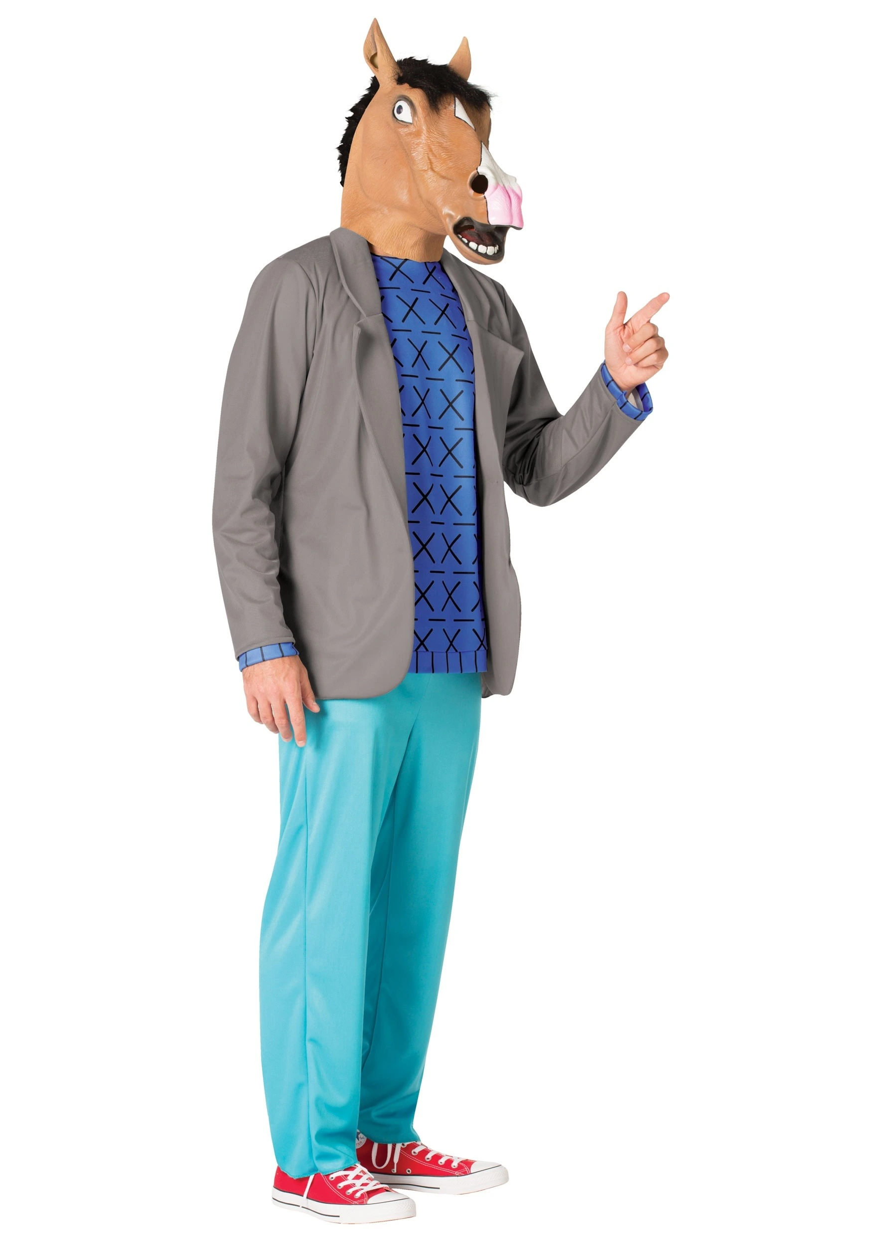 When you’re dressed in this ensemble, you’ll look just like a Hollywood star. You’ll get a bright blue pair of pants, the dark blue sweater that’s reminiscent of the wild prints that he’s been wearing since his old show. Top it all off with the latex horse mask and a surly sensibility and you’ll be ready to make another debut.