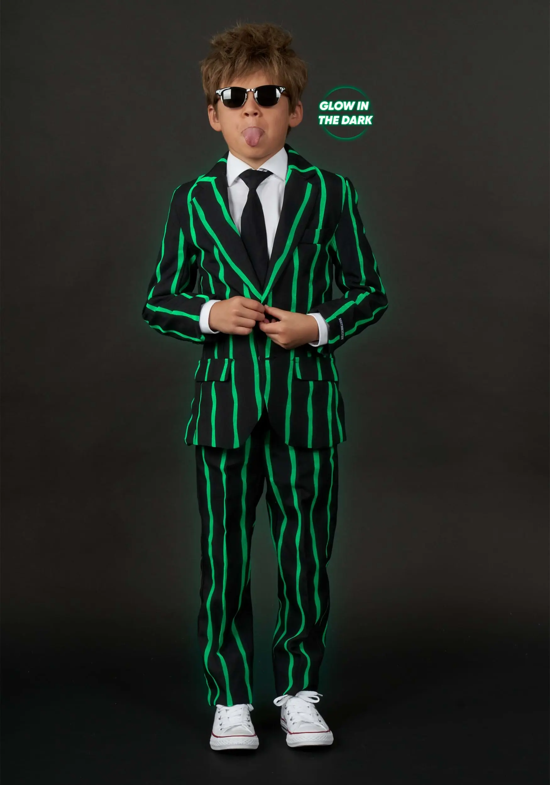 This is a Boys Glow in the Dark Oversized Pinstripe Suit.