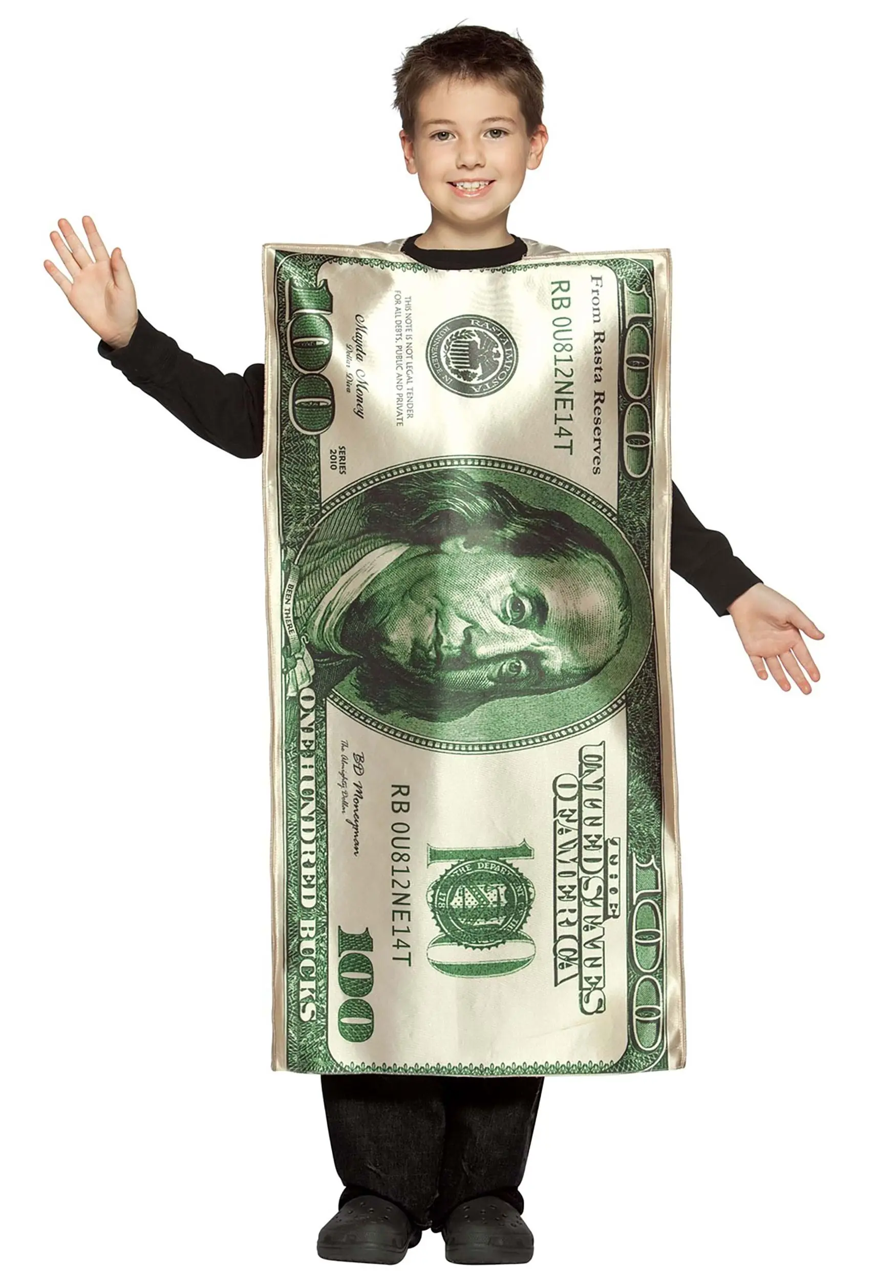 This unisex costume is about as simple as they come. It is only one piece and requires no special accessories. Order this costume and you will receive one standard-sized tunic for children. The tunic is covered in a detailed graphic of a United States 100 dollar bill from the year 2010. From Ben Franklin’s portrait to the writing, every tiny detail is included. Pull this costume over your kiddo’s head with ease. A black long-sleeve and pants will fit comfortably under this tunic.