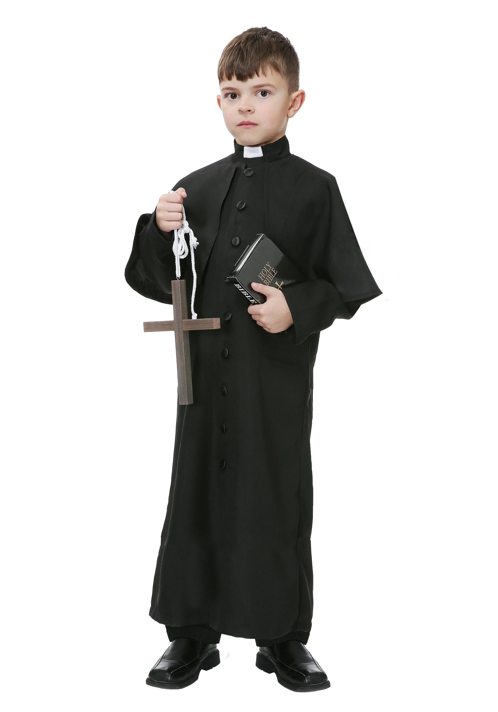 This deluxe priest costume is an outfit for kids that looks just like the grown-up outfit. It comes with a black robe with buttons along the front. It has an attached white collar and a black belt to give it an authentic look. Just pair it up with a cross, a rosary or a bible to create the look of a real, grown-up style religious outfit. It’s perfect for plays, pageants and any other event where your child needs to look like a man of the cloth.