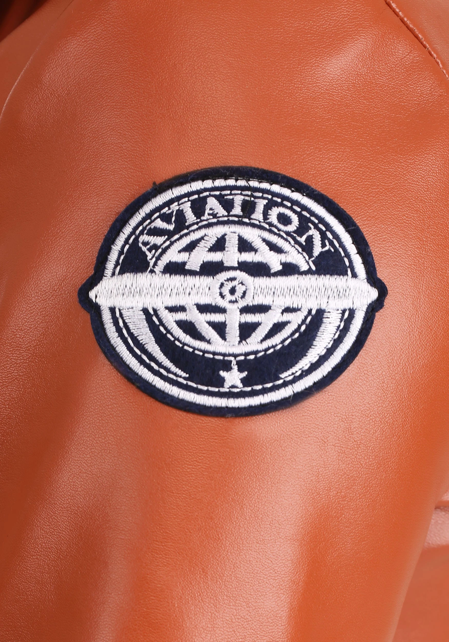 - Jacket has separating front zipper, sherpa collar, embroidered patches on both sleeves