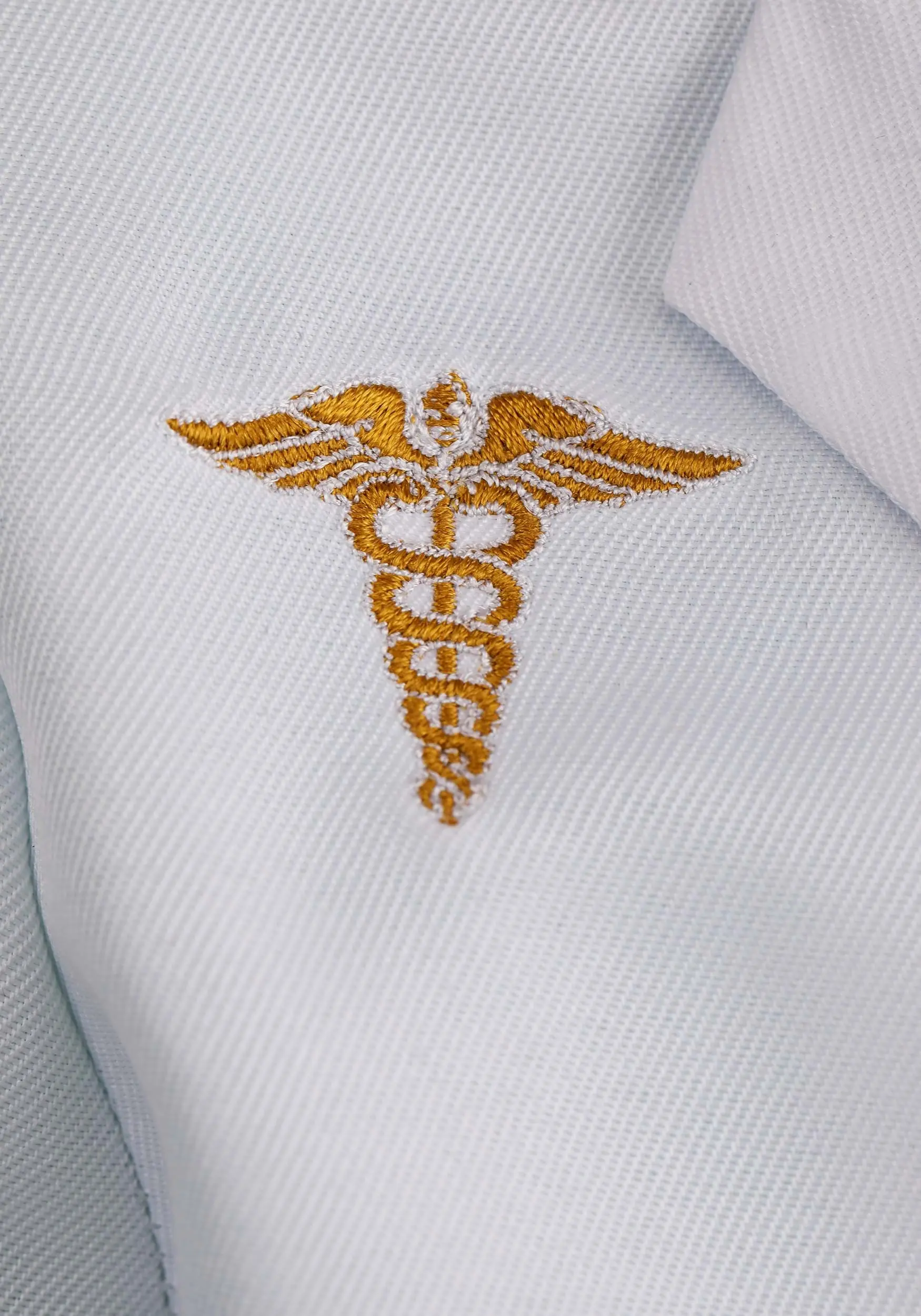 - Lab coat has functional left breast pocket, 2 false pocket flaps