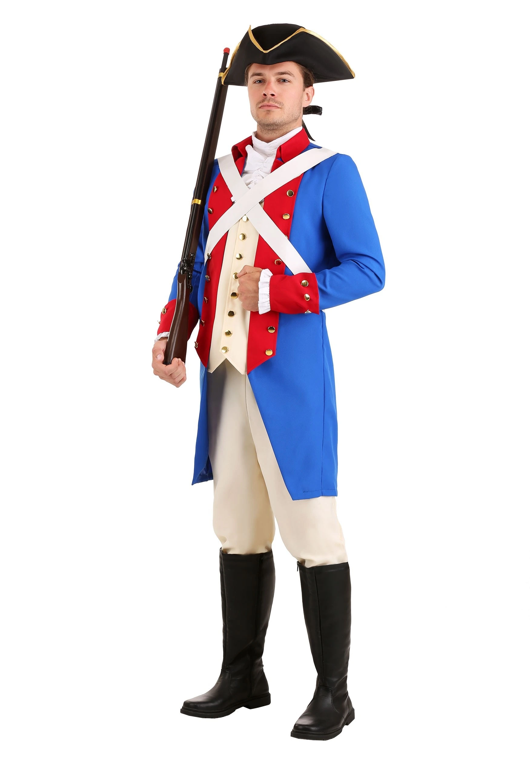 This colorful American Revolutionary War costume is Made By Us. Our history-loving in-house creative team designed this costume to look right at home on the streets of revolutionary Boston! The blue jacket has red panels in the front trimmed in gold buttons. Chest straps are layered overtop while a cream-colored vest and cravat is layered underneath. Complete with cream pants and topped with a tri-corn hat, you’ll feel ready to take your shot at independence in this costume!