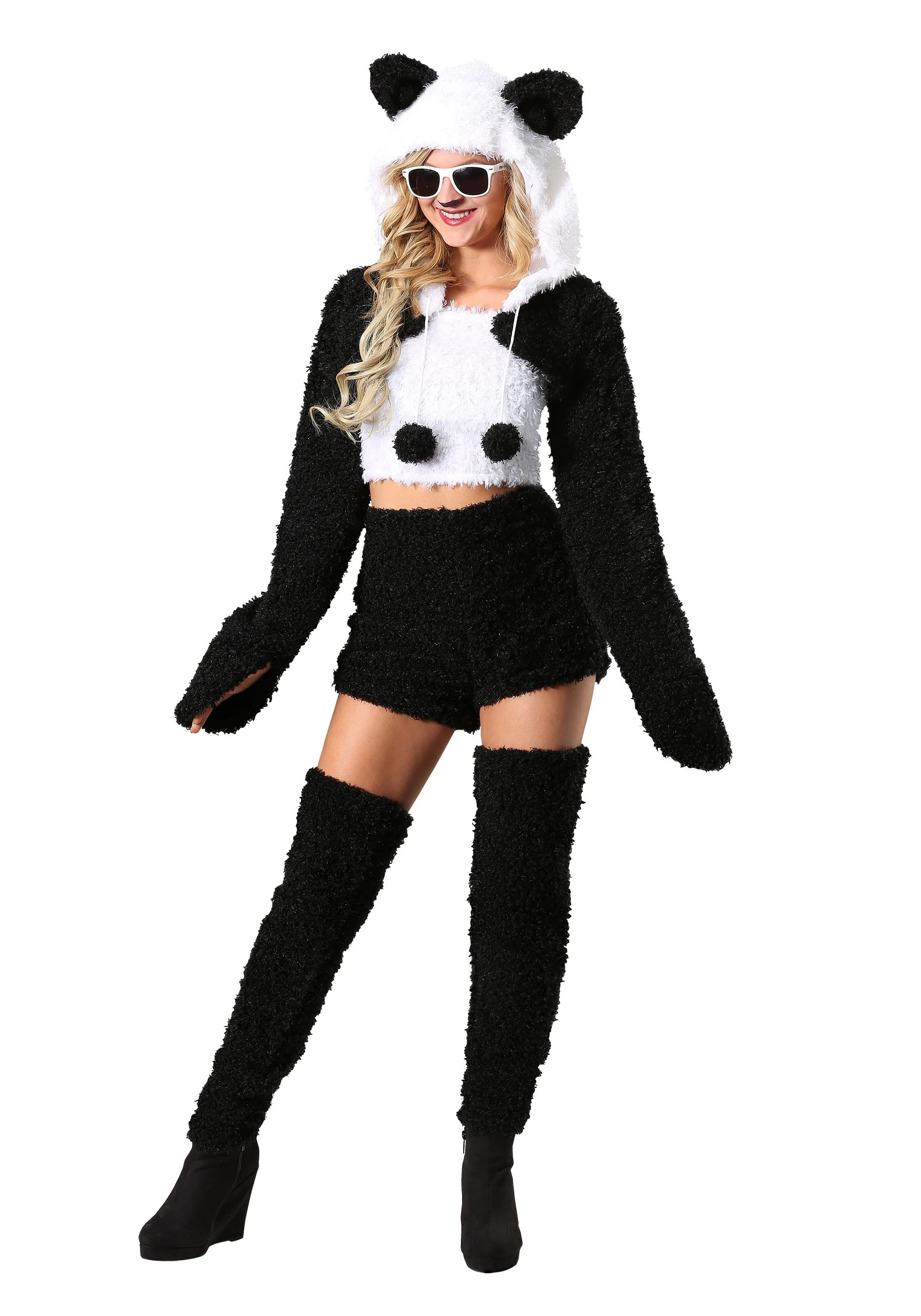Suit up for a night on the town or a romp through the zoo when you choose this delightfully sweet Panda costume. Styled as a furry halter top, hooded shrug jacket, shorts, and leg warmers, it’s going to have you ready for the panda life! Flip up the hood and pop on a pair of shades when you’re ready to party. The only thing you’re going to need to complete this style is your favorite black boots or heels!