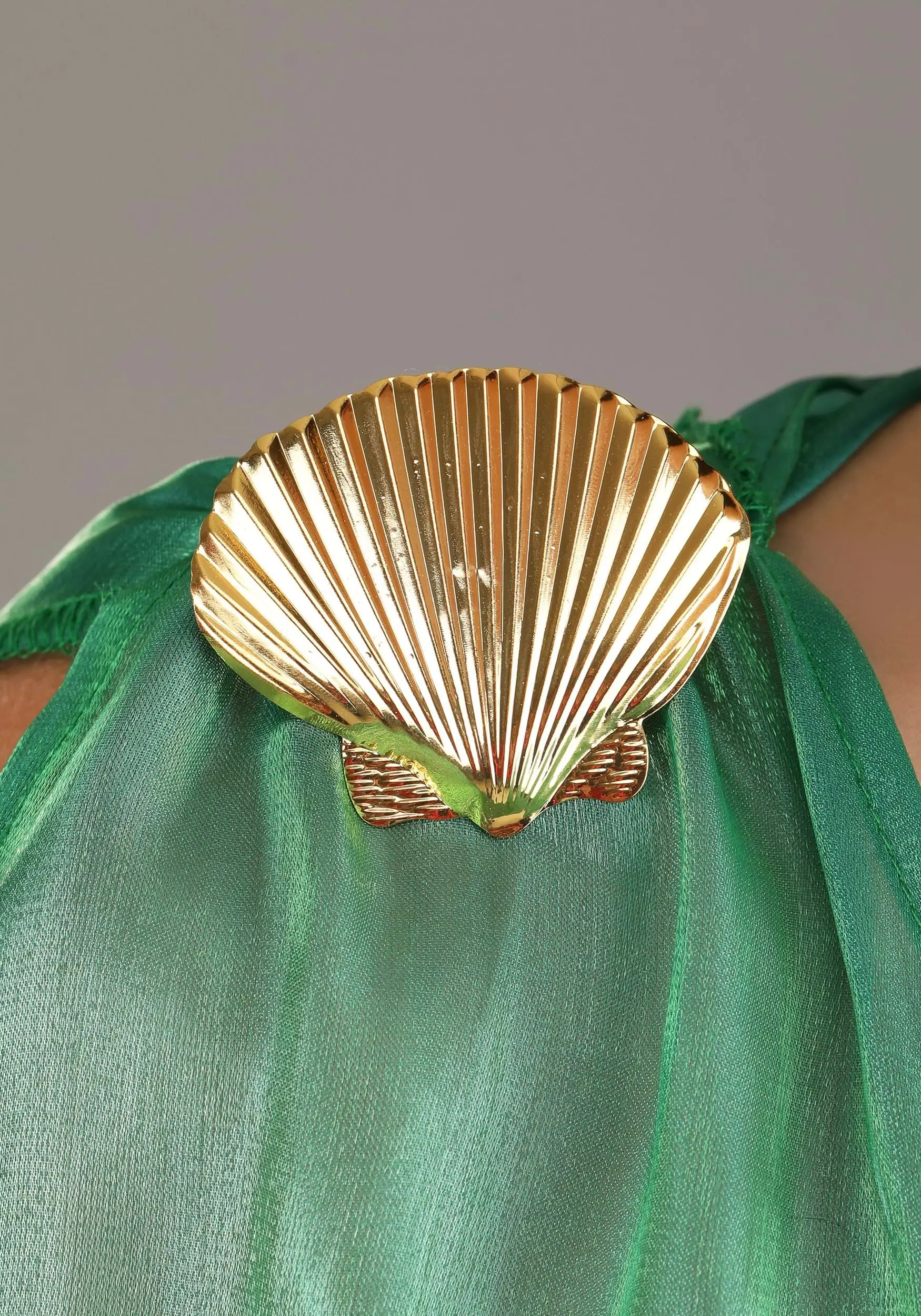 - Taffeta drape is attached at shoulder & anchored w/ gold-tone metal seashell