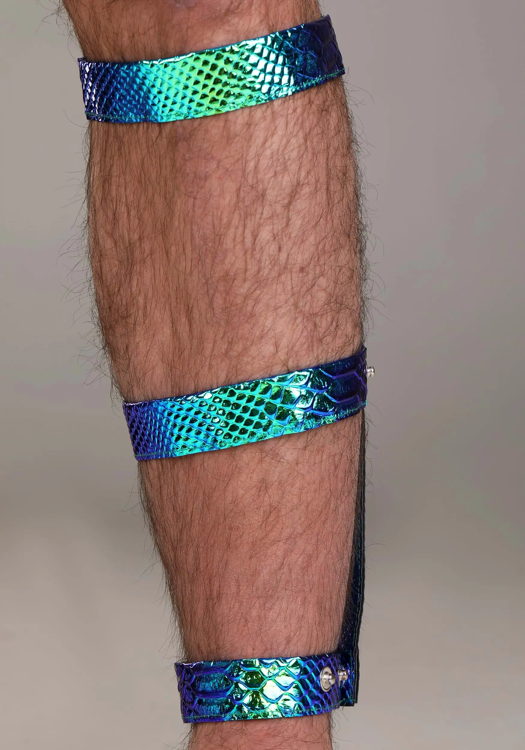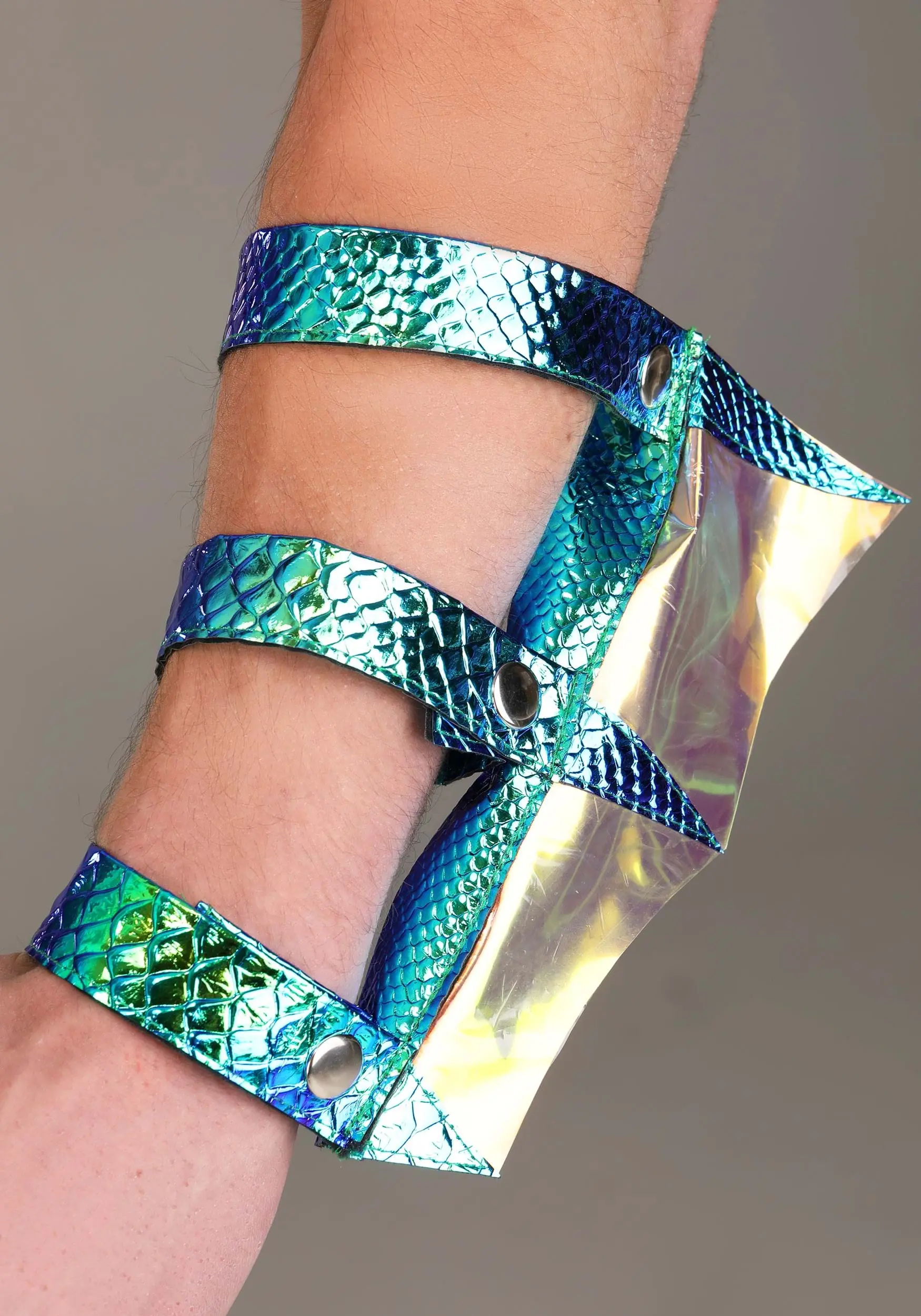 - Wrist & shin guards are iridescent blue/green faux leather w/ embossed seashell pattern