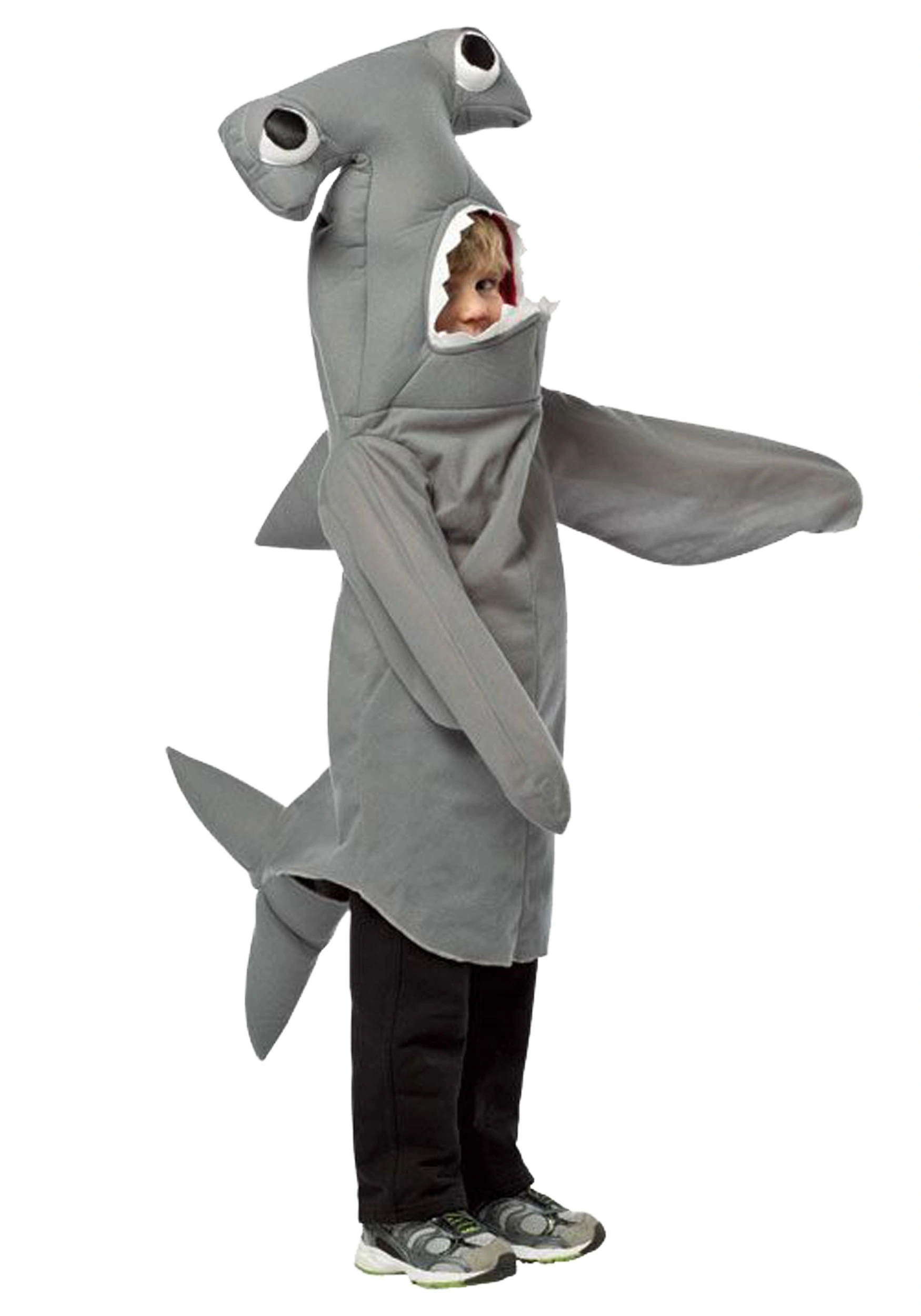 Your little one likes to squirm around just like the baby shark, and they can look just like him in the Toddler Hammerhead Shark Costume. The pullover knee-length tunic is the perfect way to show off swimming skills on land. Before wearing you must stuff the hammer head, tail, and fins with tissue paper before hand. This costume is available in child and adult sizes as well. Go as a group to swim as a school on land, or let the little one be a big fish in a little pound.