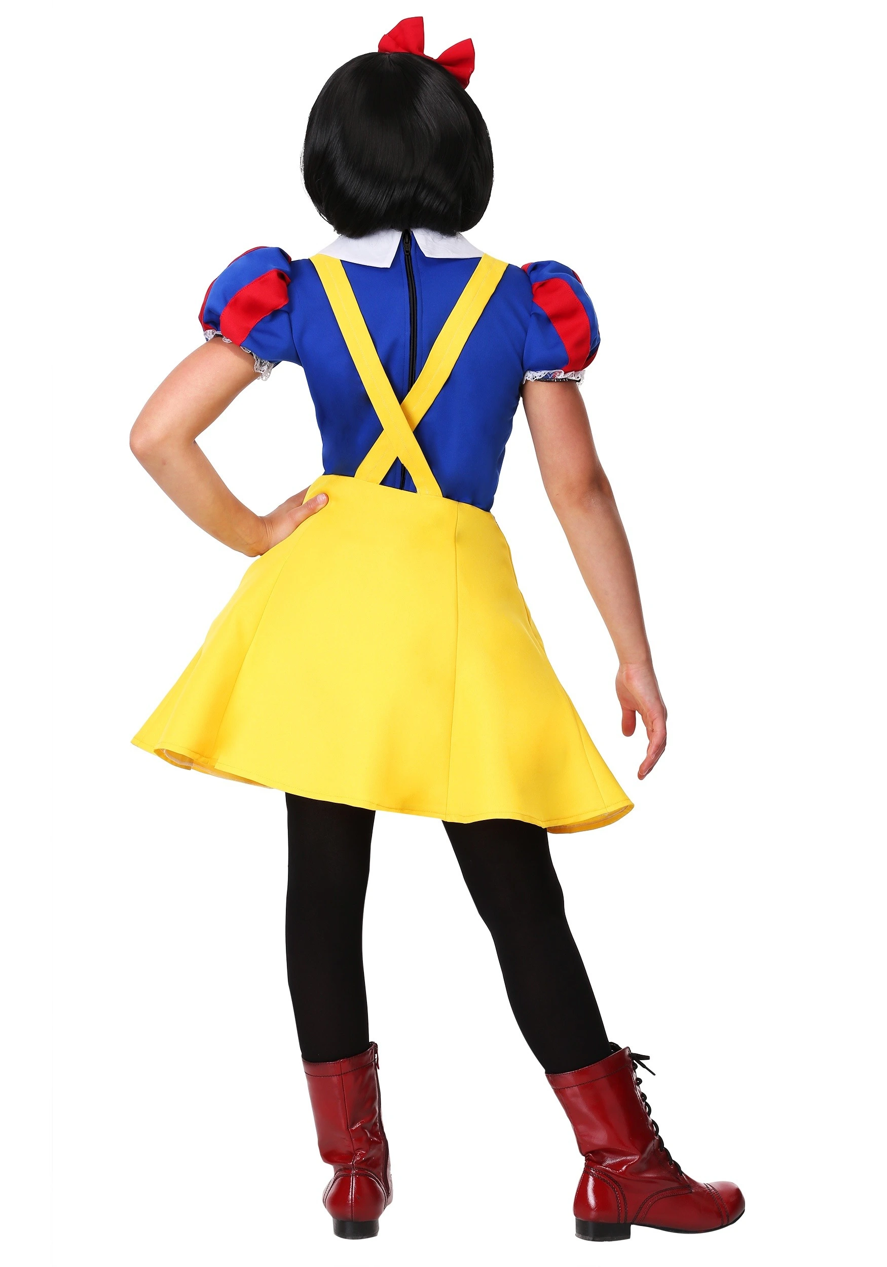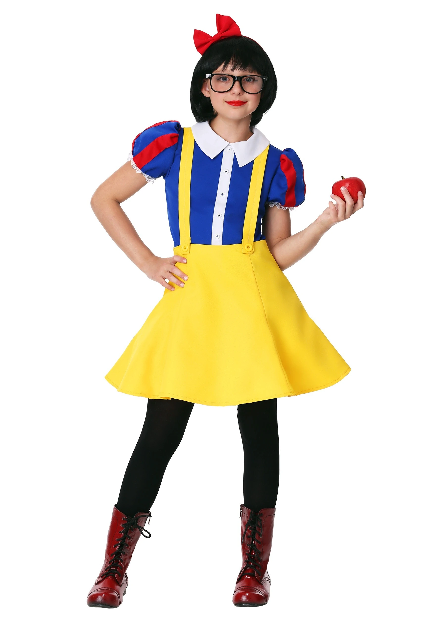 Our in-house designers have unearthed the best secrets of the Magic Mirror and put them together to create this Tween Hipster Snow White Costume. This exclusive look includes a stretchy blue shirt with red-striped, puffy sleeves and ruffled trim. The shirt is accented by a wide white collar and a button lapel down the front. The skirt is a bright yellow that features a pair of suspenders because this quirky Snow knows what keeps the world’s fashion moving forward! Finish off the look with a red bow headband and all she’ll need next is a pair of round lens glasses!
